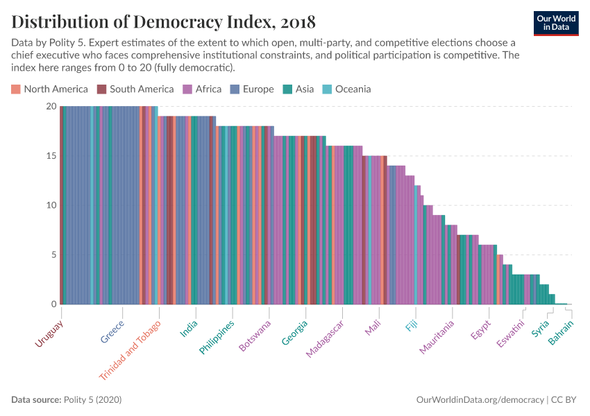 We see that countries differ in how democratic they are, with some countries close to the index’s maximum of 1, and others close to its minimum score of 0. Most countries are somewhere in the middle.