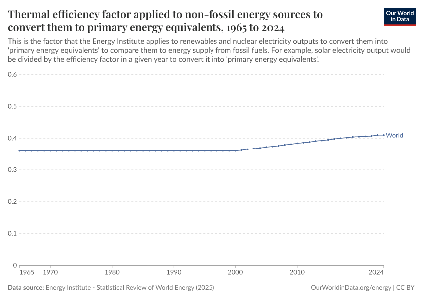 This adjustment is fairly crude. Non-fossil electricity generation is divided by a ‘thermal efficiency factor’, which is the average efficiency of fossil electricity. In the chart, we see the factor that the Energy Institute applies. This factor has changed over time due to changes in the composition of the fossil fuel mix (the split between coal and gas), and efficiency improvements in power plants over time.