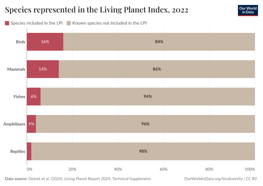 The LPI only includes data from vertebrate populations. This includes mammals, birds, reptiles, amphibians, and fish. Taxonomic groups including insects, corals, fungi, and plants are not included.