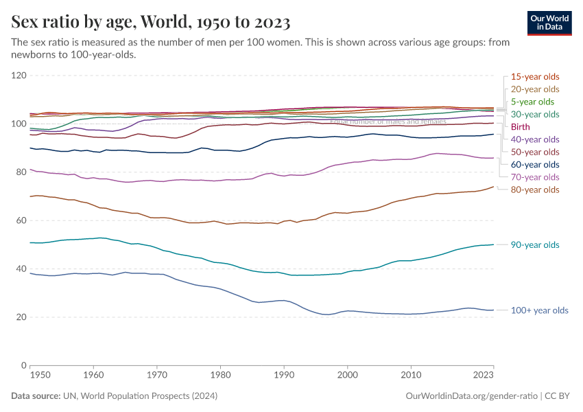 On this page, we provide an overview of how the gender ratio varies across the world and over time. We present data on how it varies between age groups and the forces that influence the gender ratio.