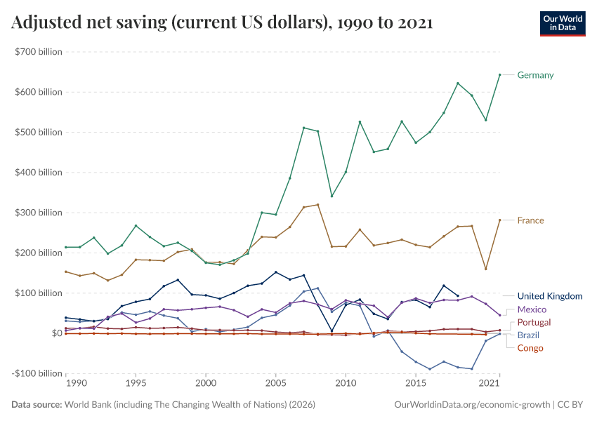 World Bank (including The Changing Wealth of Nations) (2026) – processed by Our World in Data. “Adjusted net saving (current US dollars)” [dataset]. World Bank (including The Changing Wealth of Nations), “World Development Indicators 125” [original data]. Retrieved April 14, 2026 from https://data-childlabor-ilounicef.owid.pages.dev:8789/20260304-094028/grapher/adjusted-net-saving-current-us-dollars.html (archived on March 4, 2026).Download