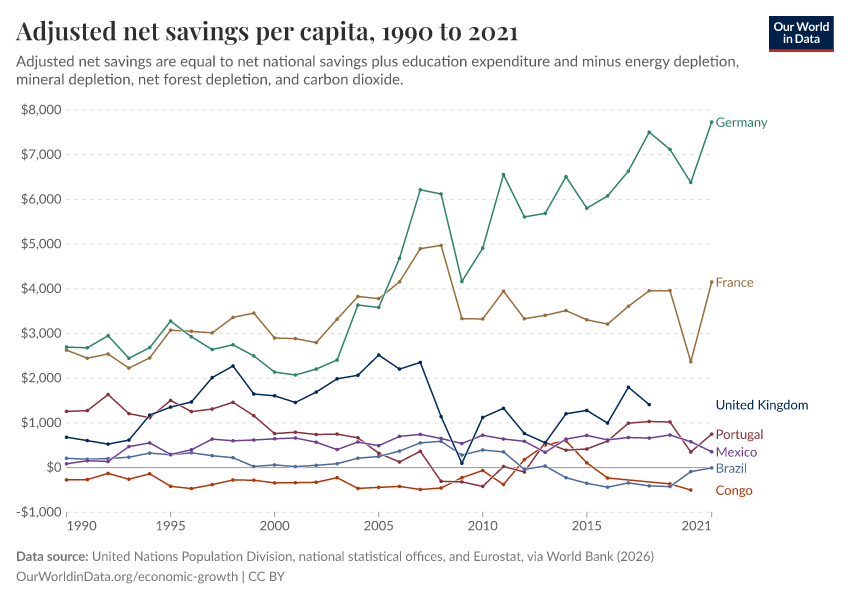 “Data Page: Adjusted net savings per capita”. Our World in Data (2026). Data adapted from United Nations Population Division, national statistical offices, and Eurostat, via World Bank. Retrieved from https://data-childlabor-ilounicef.owid.pages.dev:8789/20260304-094028/grapher/adjusted-net-savings-per-person.html [online resource] (archived on March 4, 2026).How to cite this data