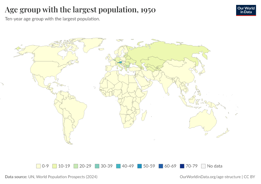 “Data Page: Ten year age-group with the highest population”. Our World in Data (2026). Data adapted from United Nations. Retrieved from https://data-childlabor-ilounicef.owid.pages.dev:8789/20260304-094028/grapher/age-group-with-the-largest-population.html [online resource] (archived on March 4, 2026).How to cite this data