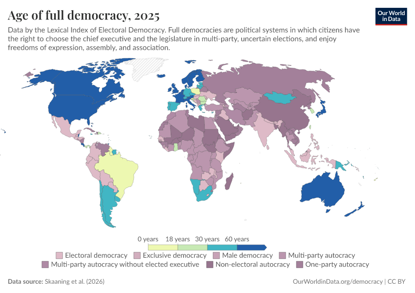 Skaaning et al. (2026) – processed by Our World in Data. “Age of full democracy” [dataset]. Skaaning et al., “Lexical Index of Electoral Democracy (LIED) v6.9” [original data]. Retrieved April 14, 2026 from https://data-childlabor-ilounicef.owid.pages.dev:8789/20260402-174958/grapher/age-of-full-democracy.html (archived on April 2, 2026).Download