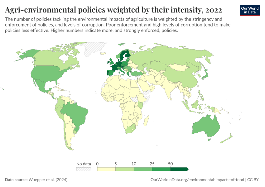 “Data Page: Agri-environmental policies weighted by their intensity”. Our World in Data (2026). Data adapted from Wuepper et al. (2024). Retrieved from https://data-childlabor-ilounicef.owid.pages.dev:8789/20260304-094028/grapher/agri-environmental-policies-intensity.html [online resource] (archived on March 4, 2026).How to cite this data