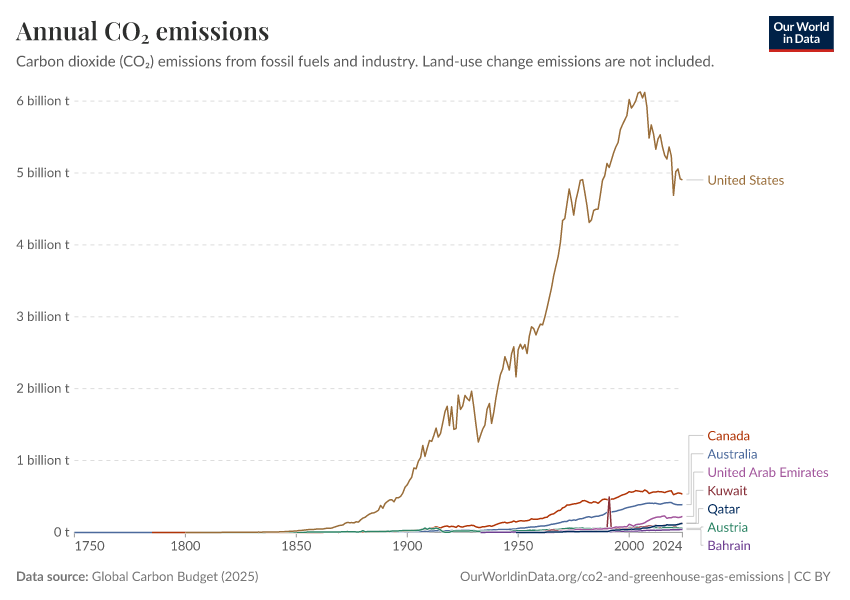 Global Carbon Budget (2025) – with major processing by Our World in Data. “Annual CO₂ emissions” [dataset]. Global Carbon Project, “Global Carbon Budget v15” [original data]. Retrieved April 14, 2026 from https://data-childlabor-ilounicef.owid.pages.dev:8789/20260304-094028/grapher/annual-co2-emissions-per-country.html (archived on March 4, 2026).Download