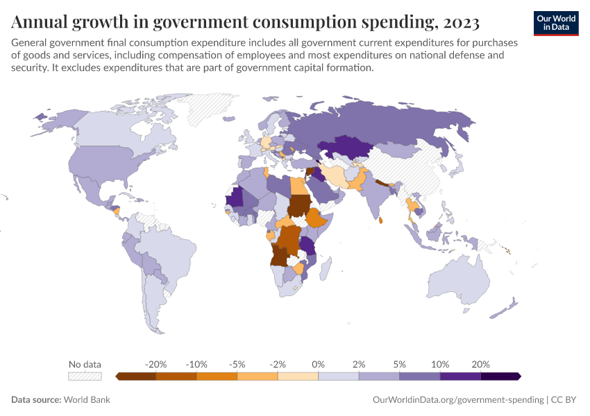 “Data Page: Annual growth in government consumption spending”. Our World in Data (2026). Data adapted from World Bank. Retrieved from https://data-childlabor-ilounicef.owid.pages.dev:8789/20260304-094028/grapher/annual-growth-of-general-government-final-consumption-expenditure.html [online resource] (archived on March 4, 2026).How to cite this data