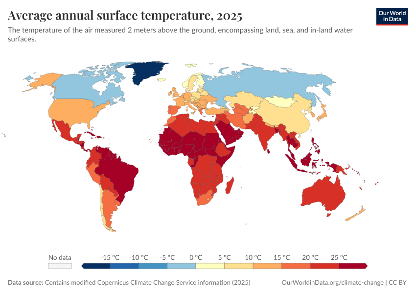 Contains modified Copernicus Climate Change Service information (2025) – with major processing by Our World in Data. “Average annual surface temperature” [dataset]. Contains modified Copernicus Climate Change Service information, “ERA5 monthly averaged data on single levels from 1940 to present 2” [original data]. Retrieved April 14, 2026 from https://data-childlabor-ilounicef.owid.pages.dev:8789/20260318-114526/grapher/average-annual-surface-temperature.html (archived on March 18, 2026).Download
