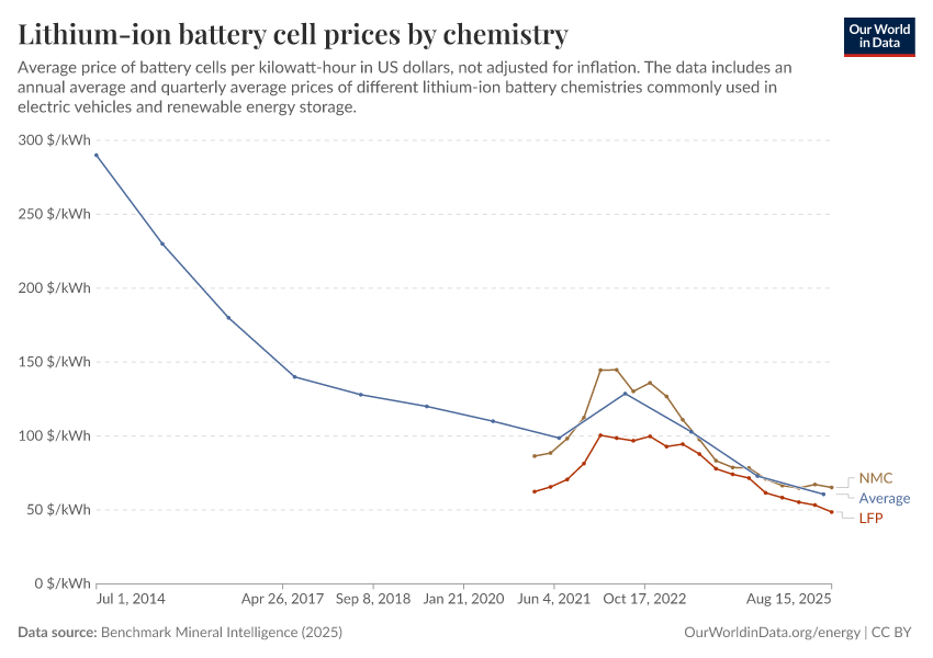 Benchmark Mineral Intelligence (2025) – with minor processing by Our World in Data. “Lithium-ion battery cell prices by chemistry” [dataset]. Benchmark Mineral Intelligence, “Lithium-ion battery prices”; Benchmark Mineral Intelligence, “Battery prices by chemistry” [original data]. Retrieved April 14, 2026 from https://data-childlabor-ilounicef.owid.pages.dev:8789/20260304-094028/grapher/average-battery-cell-price.html (archived on March 4, 2026).