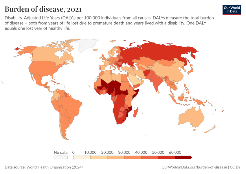 “Data Page: Burden of disease”, part of the following publication: Esteban Ortiz-Ospina and Max Roser (2016) - “Global Health”. Data adapted from World Health Organization. Retrieved from https://data-childlabor-ilounicef.owid.pages.dev:8789/20260325-171315/grapher/burden-of-disease-who.html [online resource] (archived on March 25, 2026).How to cite this data