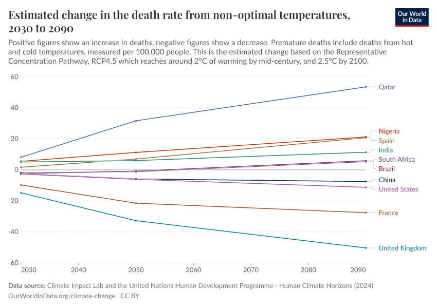 “Data Page: Estimated change in the death rate from non-optimal temperatures”. Our World in Data (2026). Data adapted from Climate Impact Lab and the United Nations Human Development Programme. Retrieved from https://data-childlabor-ilounicef.owid.pages.dev:8789/20260304-094028/grapher/change-heat-death-rate.html [online resource] (archived on March 4, 2026).How to cite this data