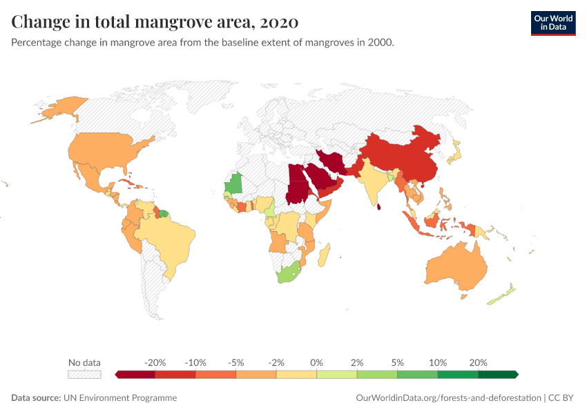 “Data Page: Change in total mangrove area”. Our World in Data (2026). Data adapted from UN Environment Programme. Retrieved from https://data-childlabor-ilounicef.owid.pages.dev:8789/20260304-094028/grapher/change-in-total-mangrove-area.html [online resource] (archived on March 4, 2026).How to cite this data