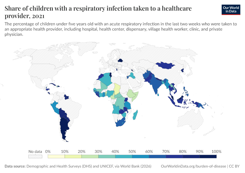 Demographic and Health Surveys (DHS) and UNICEF, via World Bank (2026) – processed by Our World in Data. “Share of children with a respiratory infection taken to a healthcare provider ” [dataset]. Demographic and Health Surveys (DHS) and UNICEF, via World Bank, “World Development Indicators 125” [original data]. Retrieved April 14, 2026 from https://data-childlabor-ilounicef.owid.pages.dev:8789/20260304-094028/grapher/children-treated-ari.html (archived on March 4, 2026).Download