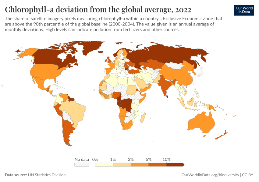 UN Statistics Division – processed by Our World in Data. “Chlorophyll-a deviation from the global average” [dataset]. UN Statistics Division, “World Environment Situation Room” [original data]. Retrieved April 14, 2026 from https://data-childlabor-ilounicef.owid.pages.dev:8789/20260304-094028/grapher/chlorophyll-a-deviation-from-the-global-average.html (archived on March 4, 2026).Download
