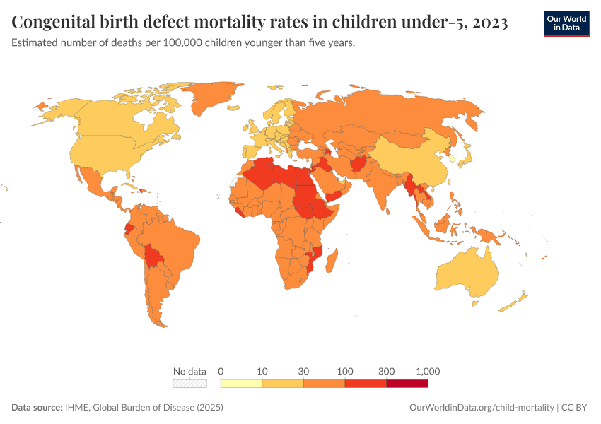 “Data Page: Congenital birth defect mortality rates in children under-5”, part of the following publication: Esteban Ortiz-Ospina and Max Roser (2016) - “Global Health”. Data adapted from IHME, Global Burden of Disease. Retrieved from https://data-childlabor-ilounicef.owid.pages.dev:8789/20260323-161325/grapher/congenital-birth-defect-mortality-rates-in-children-under-5.html [online resource] (archived on March 23, 2026).How to cite this data