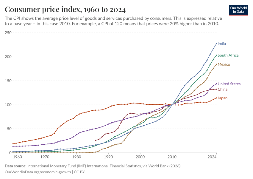 International Monetary Fund (IMF) International Financial Statistics, via World Bank (2026) – processed by Our World in Data. “Consumer price index” [dataset]. International Monetary Fund (IMF) International Financial Statistics, via World Bank, “World Development Indicators 125” [original data]. Retrieved April 14, 2026 from https://data-childlabor-ilounicef.owid.pages.dev:8789/20260304-094028/grapher/consumer-price-index.html (archived on March 4, 2026).Download