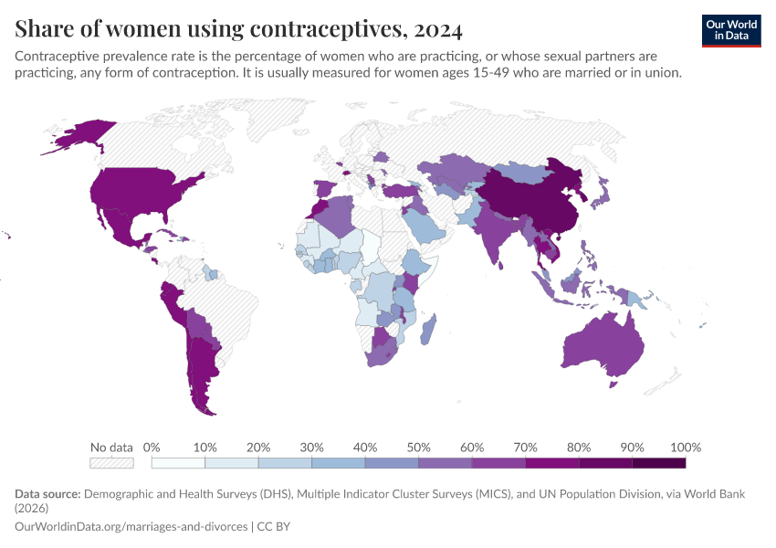 “Data Page: Share of women using contraceptives”. Our World in Data (2026). Data adapted from Demographic and Health Surveys (DHS), Multiple Indicator Cluster Surveys (MICS), and UN Population Division, via World Bank. Retrieved from https://data-childlabor-ilounicef.owid.pages.dev:8789/20260304-094028/grapher/contraceptive-prevalence-any-methods-of-women-ages-15-49.html [online resource] (archived on March 4, 2026).How to cite this data