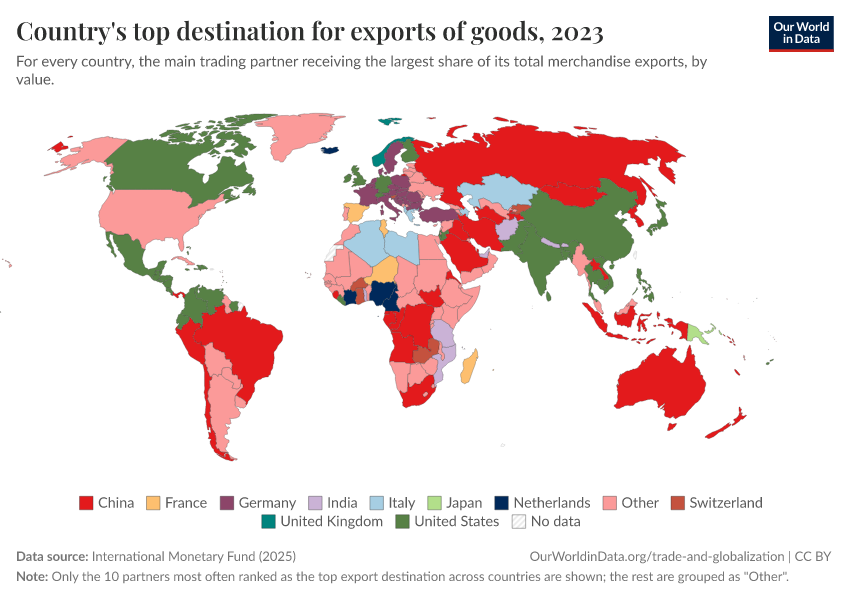 International Monetary Fund (2025) – with major processing by Our World in Data. “Top export partner category” [dataset]. International Monetary Fund, “International Trade in Goods (by partner country) (IMTS)” [original data]. Retrieved April 14, 2026 from https://data-childlabor-ilounicef.owid.pages.dev:8789/20260304-094028/grapher/countrys-top-destination-for-exports-of-goods.html (archived on March 4, 2026).Download