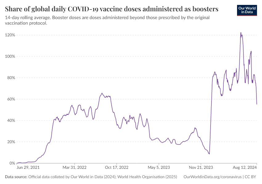 Official data collated by Our World in Data (2024); World Health Organisation (2025) – with major processing by Our World in Data. “Share of global daily COVID-19 vaccine doses administered as boosters” [dataset]. Official data collated by Our World in Data, “COVID-19, vaccinations”; World Health Organisation, “COVID-19, vaccinations (WHO)” [original data]. Retrieved April 14, 2026 from https://data-childlabor-ilounicef.owid.pages.dev:8789/20260304-094028/grapher/covid-vaccine-share-boosters.html (archived on March 4, 2026).Download