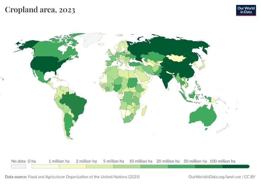 Food and Agriculture Organization of the United Nations (2025) – with major processing by Our World in Data. “Cropland area – UN FAO” [dataset]. Food and Agriculture Organization of the United Nations, “Land, Inputs and Sustainability: Land Use” [original data]. Retrieved April 14, 2026 from https://data-childlabor-ilounicef.owid.pages.dev:8789/20260304-094028/grapher/cropland-area.html (archived on March 4, 2026).Download