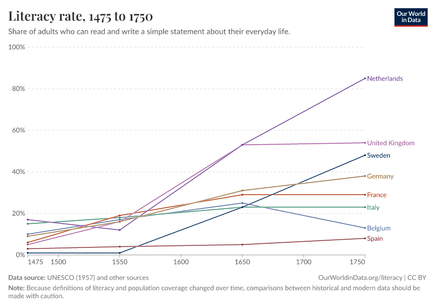 - 1451–1800: Direct literacy surveys did not exist during this period. Data for Great Britain, Ireland, France, Belgium, the Netherlands, Germany, Italy, Spain, Sweden, and Poland comes from the "Charting the Rise of the West" study. The authors estimated literacy rates using manuscript and book production as indirect indicators. While more books likely indicated more readers, this approach has clear limitations.