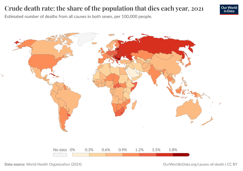 World Health Organization (2024) – with major processing by Our World in Data. “Crude death rate: the share of the population that dies each year” [dataset]. World Health Organization, “Global Health Estimates” [original data]. Retrieved April 14, 2026 from https://data-childlabor-ilounicef.owid.pages.dev:8789/20260325-171315/grapher/crude-death-rate-the-share-of-the-population-that-dies-each-year-who.html (archived on March 25, 2026).Download