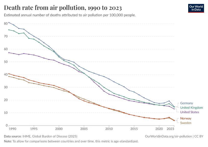 IHME, Global Burden of Disease (2025) – with major processing by Our World in Data. “Death rate from air pollution – IHME” [dataset]. IHME, Global Burden of Disease, “Global Burden of Disease - Risk Factors - Deaths” [original data]. Retrieved April 14, 2026 from https://data-childlabor-ilounicef.owid.pages.dev:8789/20260323-141905/grapher/death-rate-from-air-pollution-per-100000.html (archived on March 23, 2026).