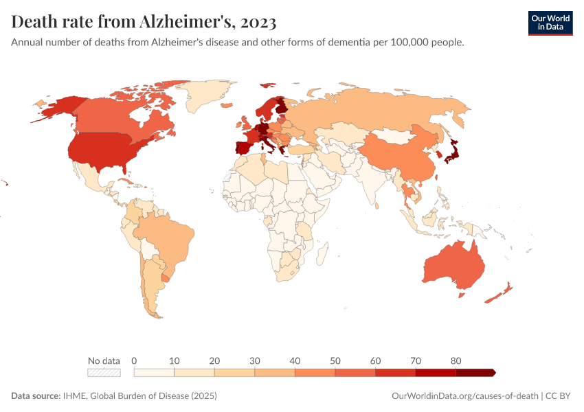 IHME, Global Burden of Disease (2025) – with major processing by Our World in Data. “Death rate from Alzheimer's – IHME” [dataset]. IHME, Global Burden of Disease, “Global Burden of Disease - Deaths” [original data]. Retrieved April 14, 2026 from https://data-childlabor-ilounicef.owid.pages.dev:8789/20260323-161325/grapher/death-rate-from-alzheimers-other-dementias-gbd.html (archived on March 23, 2026).