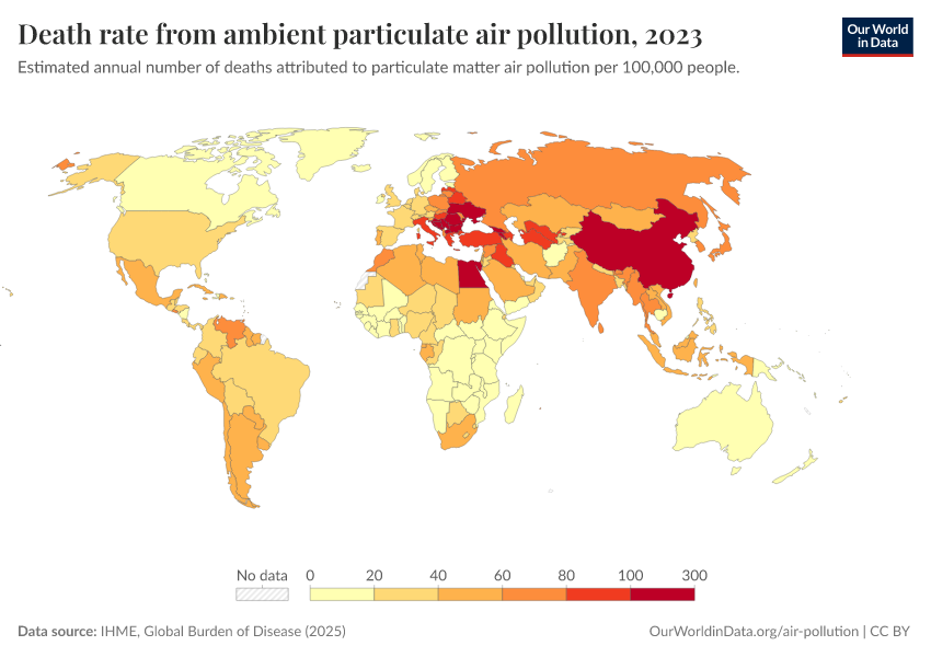 IHME, Global Burden of Disease (2025) – with major processing by Our World in Data. “Death rate from ambient particulate air pollution – IHME” [dataset]. IHME, Global Burden of Disease, “Global Burden of Disease - Risk Factors - Deaths” [original data]. Retrieved April 14, 2026 from https://data-childlabor-ilounicef.owid.pages.dev:8789/20260319-180505/grapher/death-rate-from-ambient-particulate-air-pollution.html (archived on March 19, 2026).