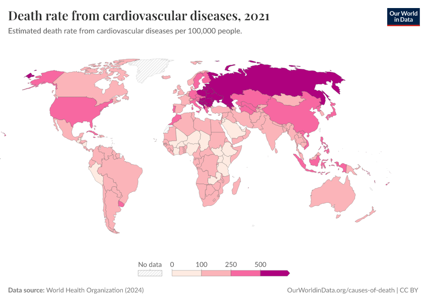 World Health Organization (2024) – with major processing by Our World in Data. “Death rate from cardiovascular diseases” [dataset]. World Health Organization, “Global Health Estimates” [original data]. Retrieved April 14, 2026 from https://data-childlabor-ilounicef.owid.pages.dev:8789/20260325-171315/grapher/death-rate-from-cardiovascular-disease-ghe.html (archived on March 25, 2026).Download