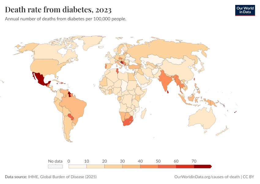 IHME, Global Burden of Disease (2025) – with major processing by Our World in Data. “Death rate from diabetes – IHME” [dataset]. IHME, Global Burden of Disease, “Global Burden of Disease - Deaths” [original data]. Retrieved April 14, 2026 from https://data-childlabor-ilounicef.owid.pages.dev:8789/20260323-161325/grapher/death-rate-from-diabetes-gbd.html (archived on March 23, 2026).