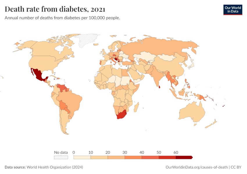 “Data Page: Death rate from diabetes”, part of the following publication: Esteban Ortiz-Ospina and Max Roser (2016) - “Global Health”. Data adapted from World Health Organization. Retrieved from https://data-childlabor-ilounicef.owid.pages.dev:8789/20260325-171315/grapher/death-rate-from-diabetes-ghe.html [online resource] (archived on March 25, 2026).How to cite this data