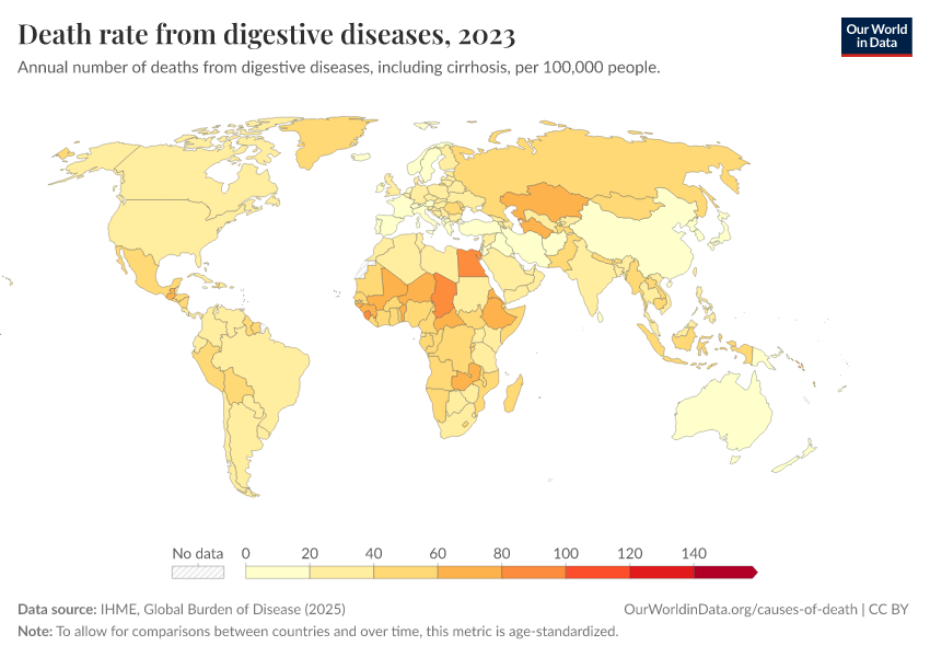 IHME, Global Burden of Disease (2025) – with major processing by Our World in Data. “Death rate from digestive diseases – IHME” [dataset]. IHME, Global Burden of Disease, “Global Burden of Disease - Deaths” [original data]. Retrieved April 14, 2026 from https://data-childlabor-ilounicef.owid.pages.dev:8789/20260323-161325/grapher/death-rate-from-digestive-diseases.html (archived on March 23, 2026).