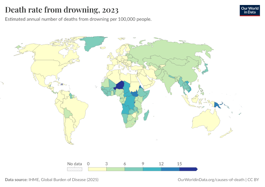 IHME, Global Burden of Disease (2025) – with major processing by Our World in Data. “Death rate from drowning – IHME” [dataset]. IHME, Global Burden of Disease, “Global Burden of Disease - Deaths” [original data]. Retrieved April 14, 2026 from https://data-childlabor-ilounicef.owid.pages.dev:8789/20260323-161325/grapher/death-rate-from-drowning.html (archived on March 23, 2026).