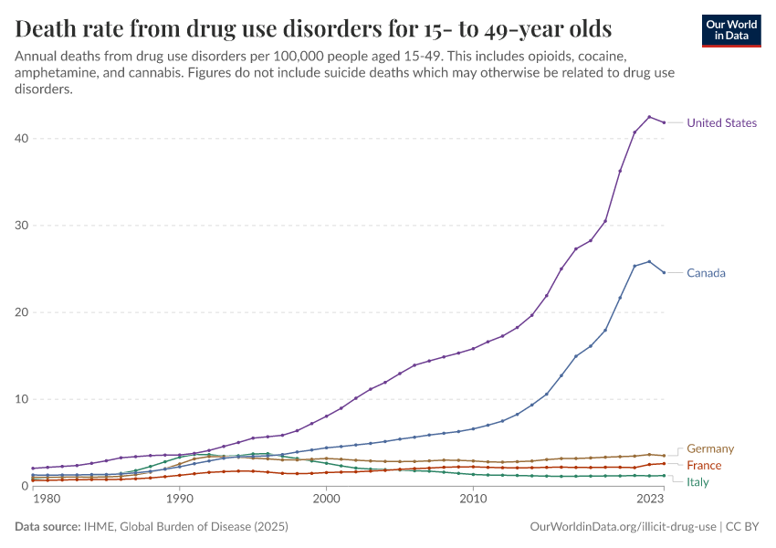 IHME, Global Burden of Disease (2025) – with major processing by Our World in Data. “Death rate from drug use disorders for 15- to 49-year olds – IHME” [dataset]. IHME, Global Burden of Disease, “Global Burden of Disease - Deaths” [original data]. Retrieved April 14, 2026 from https://data-childlabor-ilounicef.owid.pages.dev:8789/20260323-161325/grapher/death-rate-from-drug-use-disorders-for-15--to-49-year-olds.html (archived on March 23, 2026).