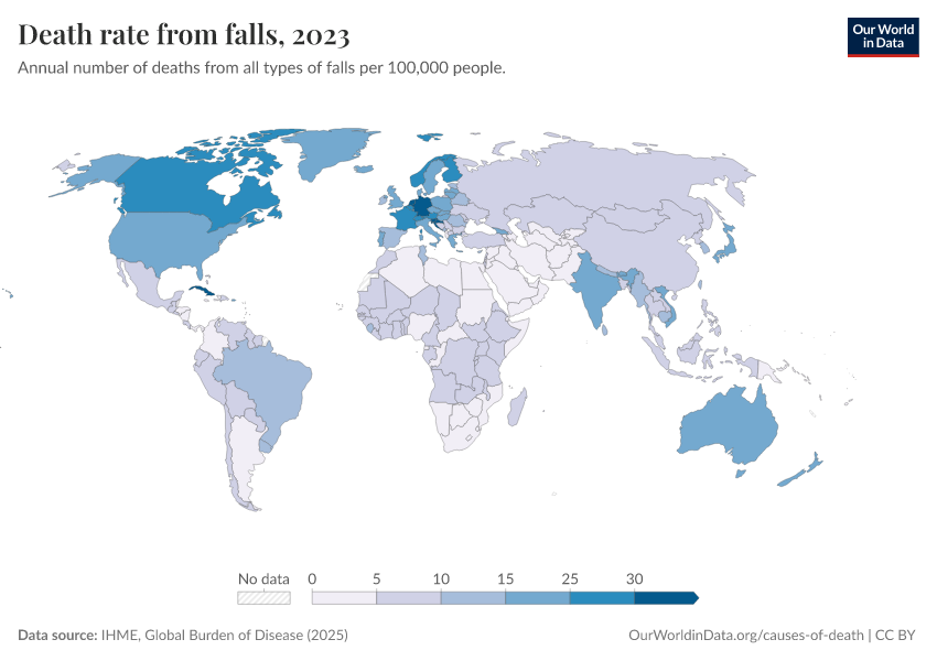 IHME, Global Burden of Disease (2025) – with major processing by Our World in Data. “Death rate from falls – IHME” [dataset]. IHME, Global Burden of Disease, “Global Burden of Disease - Deaths” [original data]. Retrieved April 14, 2026 from https://data-childlabor-ilounicef.owid.pages.dev:8789/20260323-161325/grapher/death-rate-from-falls-gbd-rate.html (archived on March 23, 2026).