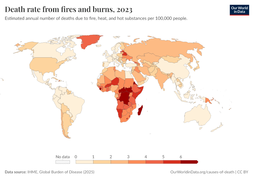IHME, Global Burden of Disease (2025) – with major processing by Our World in Data. “Death rate from fires and burns – IHME” [dataset]. IHME, Global Burden of Disease, “Global Burden of Disease - Deaths” [original data]. Retrieved April 14, 2026 from https://data-childlabor-ilounicef.owid.pages.dev:8789/20260323-161325/grapher/death-rate-from-fires-and-burns-ihme.html (archived on March 23, 2026).