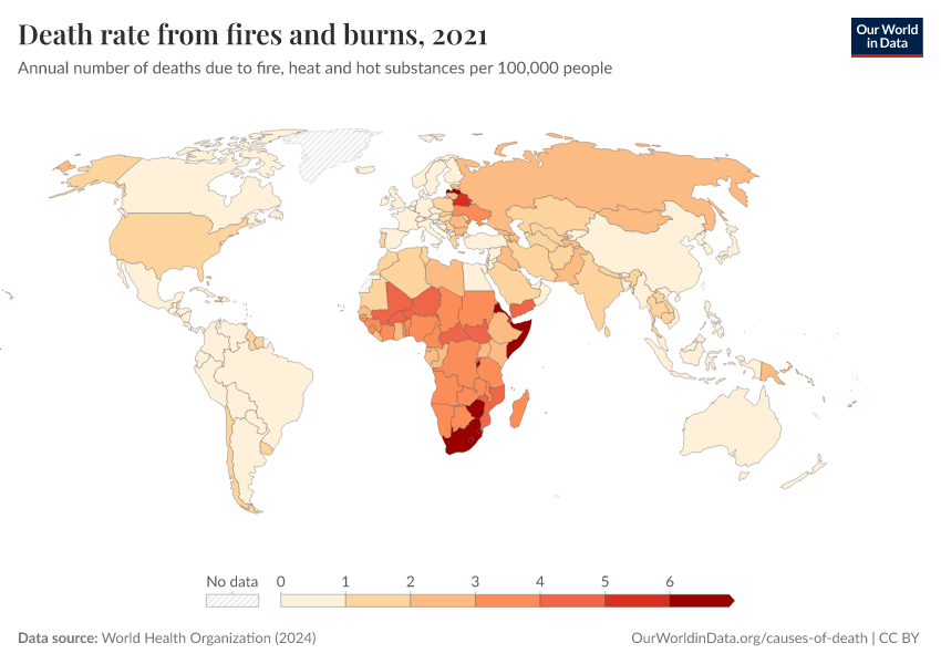“Data Page: Death rate from fires and burns”, part of the following publication: Esteban Ortiz-Ospina and Max Roser (2016) - “Global Health”. Data adapted from World Health Organization. Retrieved from https://data-childlabor-ilounicef.owid.pages.dev:8789/20260325-171315/grapher/death-rate-from-fires-and-burns-who.html [online resource] (archived on March 25, 2026).How to cite this data