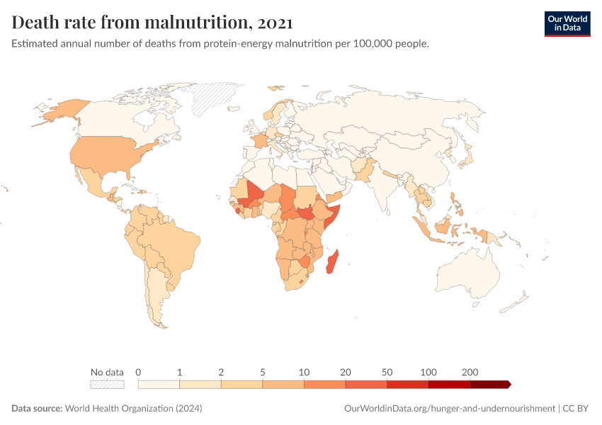 World Health Organization (2024) – with major processing by Our World in Data. “Death rate from malnutrition” [dataset]. World Health Organization, “Global Health Estimates” [original data]. Retrieved April 14, 2026 from https://data-childlabor-ilounicef.owid.pages.dev:8789/20260325-171315/grapher/death-rate-from-malnutrition-ghe.html (archived on March 25, 2026).Download