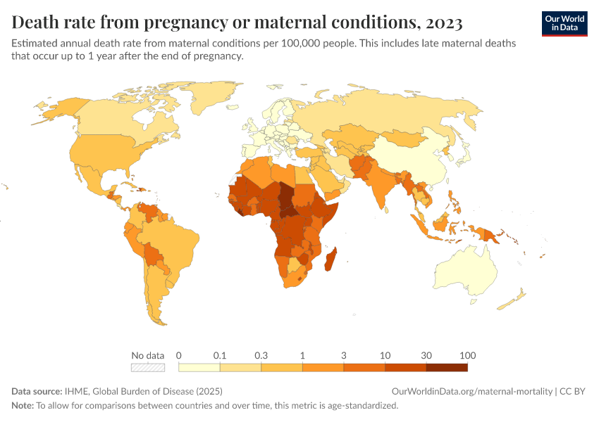 IHME, Global Burden of Disease (2025) – with major processing by Our World in Data. “Death rate from pregnancy or maternal conditions – IHME” [dataset]. IHME, Global Burden of Disease, “Global Burden of Disease - Deaths” [original data]. Retrieved April 14, 2026 from https://data-childlabor-ilounicef.owid.pages.dev:8789/20260323-161325/grapher/death-rate-from-maternal-disorders-ihme.html (archived on March 23, 2026).