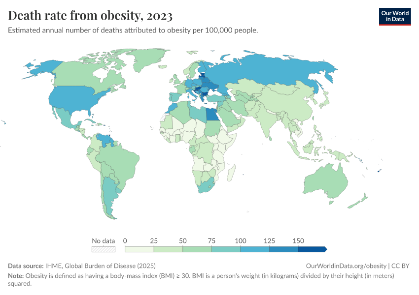 IHME, Global Burden of Disease (2025) – with major processing by Our World in Data. “Death rate from obesity – IHME” [dataset]. IHME, Global Burden of Disease, “Global Burden of Disease - Risk Factors - Deaths” [original data]. Retrieved April 14, 2026 from https://data-childlabor-ilounicef.owid.pages.dev:8789/20260319-180505/grapher/death-rate-from-obesity-gbd.html (archived on March 19, 2026).