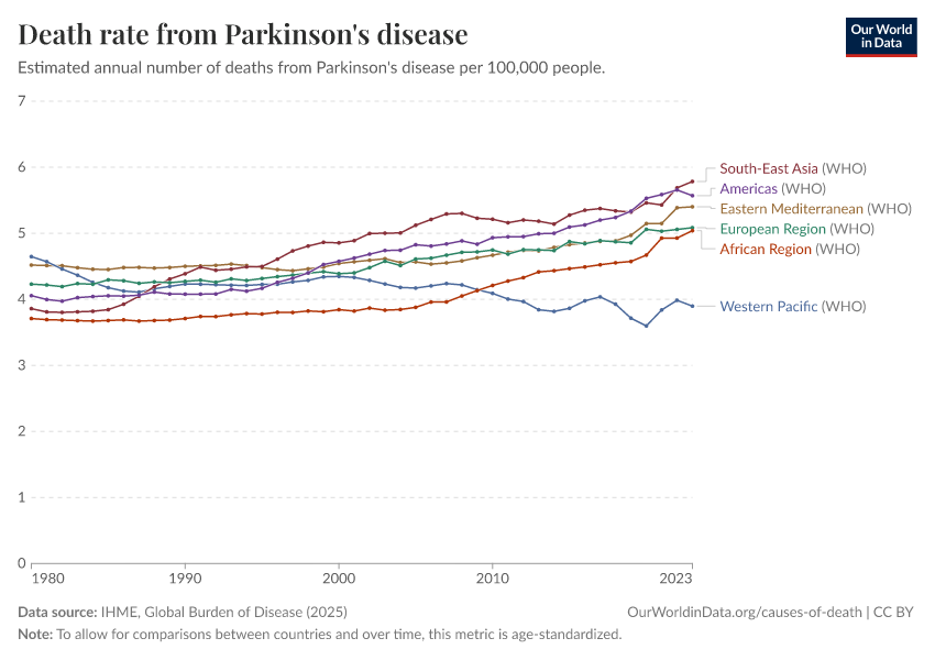 IHME, Global Burden of Disease (2025) – with major processing by Our World in Data. “Death rate from Parkinson's disease – IHME” [dataset]. IHME, Global Burden of Disease, “Global Burden of Disease - Deaths” [original data]. Retrieved April 14, 2026 from https://data-childlabor-ilounicef.owid.pages.dev:8789/20260323-161325/grapher/death-rate-from-parkinsons-disease.html (archived on March 23, 2026).