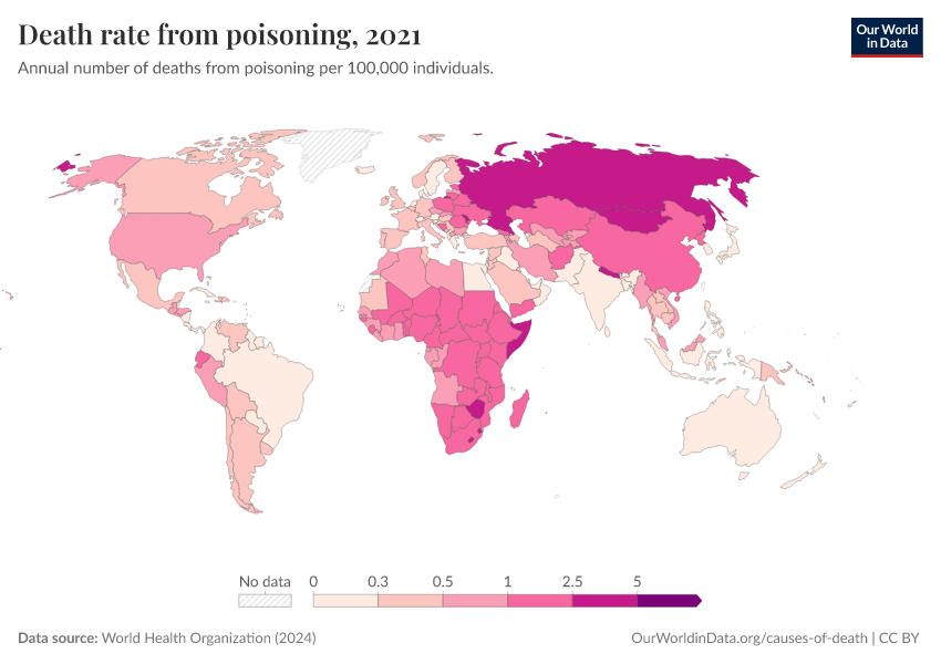 World Health Organization (2024) – with major processing by Our World in Data. “Death rate from poisoning” [dataset]. World Health Organization, “Global Health Estimates” [original data]. Retrieved April 14, 2026 from https://data-childlabor-ilounicef.owid.pages.dev:8789/20260325-171315/grapher/death-rate-from-poisoning-ghe.html (archived on March 25, 2026).Download