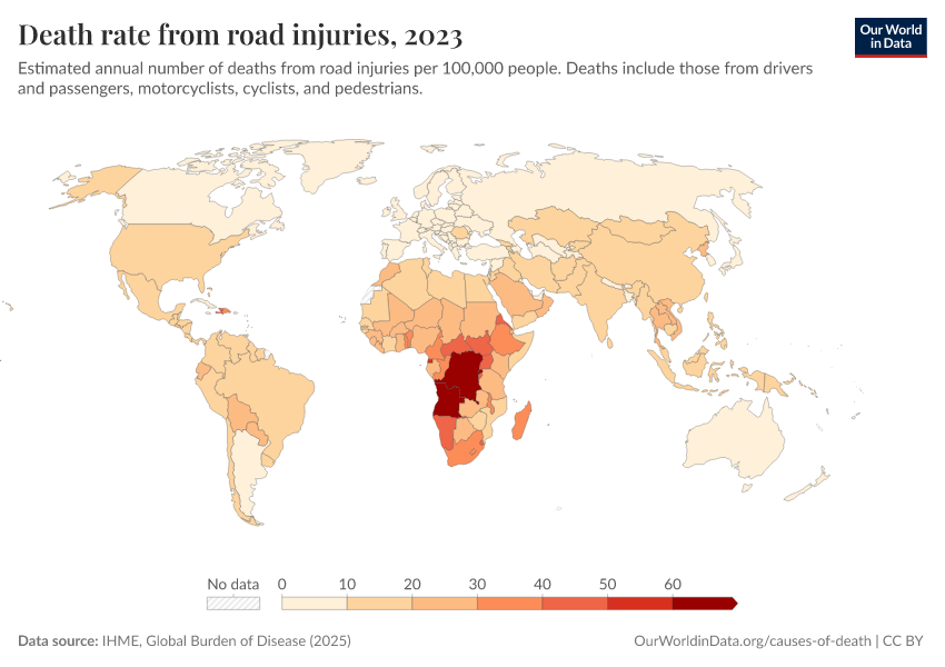 IHME, Global Burden of Disease (2025) – with major processing by Our World in Data. “Death rate from road injuries – IHME” [dataset]. IHME, Global Burden of Disease, “Global Burden of Disease - Deaths” [original data]. Retrieved April 14, 2026 from https://data-childlabor-ilounicef.owid.pages.dev:8789/20260323-161325/grapher/death-rate-from-road-accidents.html (archived on March 23, 2026).