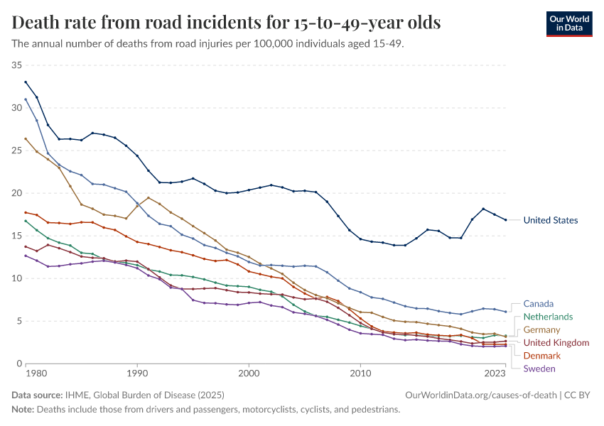 IHME, Global Burden of Disease (2025) – with major processing by Our World in Data. “Death rate from road incidents for 15-to-49-year olds – IHME” [dataset]. IHME, Global Burden of Disease, “Global Burden of Disease - Deaths” [original data]. Retrieved April 14, 2026 from https://data-childlabor-ilounicef.owid.pages.dev:8789/20260323-161325/grapher/death-rate-from-road-accidents-for-15--to-49-year-olds.html (archived on March 23, 2026).