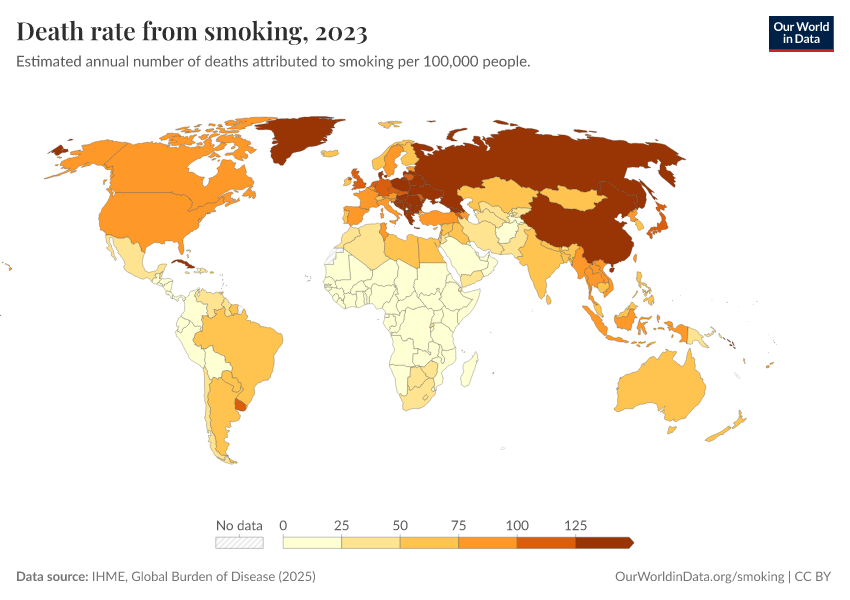 IHME, Global Burden of Disease (2025) – with major processing by Our World in Data. “Death rate from smoking – IHME” [dataset]. IHME, Global Burden of Disease, “Global Burden of Disease - Risk Factors - Deaths” [original data]. Retrieved April 14, 2026 from https://data-childlabor-ilounicef.owid.pages.dev:8789/20260319-180505/grapher/death-rate-from-smoking.html (archived on March 19, 2026).