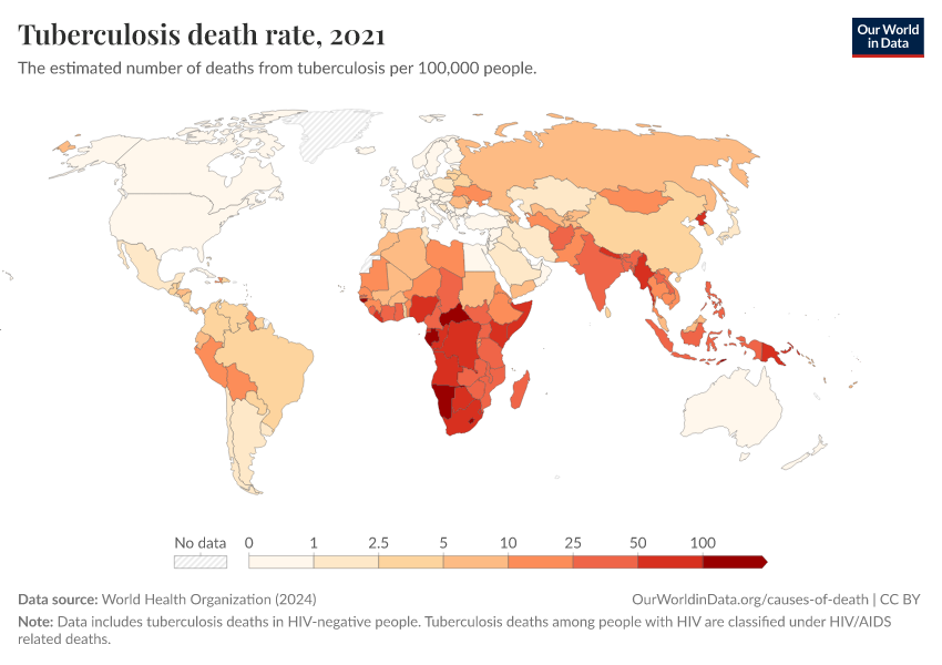 World Health Organization (2024) – with major processing by Our World in Data. “Tuberculosis death rate” [dataset]. World Health Organization, “Global Health Estimates” [original data]. Retrieved April 14, 2026 from https://data-childlabor-ilounicef.owid.pages.dev:8789/20260325-171315/grapher/death-rate-from-tuberculosis-ghe.html (archived on March 25, 2026).Download