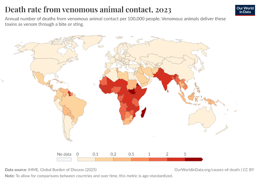 IHME, Global Burden of Disease (2025) – with major processing by Our World in Data. “Death rate from venomous animal contact – IHME” [dataset]. IHME, Global Burden of Disease, “Global Burden of Disease - Deaths” [original data]. Retrieved April 14, 2026 from https://data-childlabor-ilounicef.owid.pages.dev:8789/20260323-161325/grapher/death-rate-from-venomous-animal.html (archived on March 23, 2026).