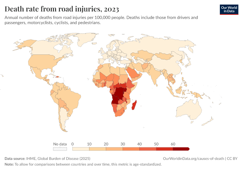 IHME, Global Burden of Disease (2025) – with major processing by Our World in Data. “Death rate from road injuries – IHME” [dataset]. IHME, Global Burden of Disease, “Global Burden of Disease - Deaths” [original data]. Retrieved April 14, 2026 from https://data-childlabor-ilounicef.owid.pages.dev:8789/20260323-161325/grapher/death-rates-road-incidents.html (archived on March 23, 2026).
