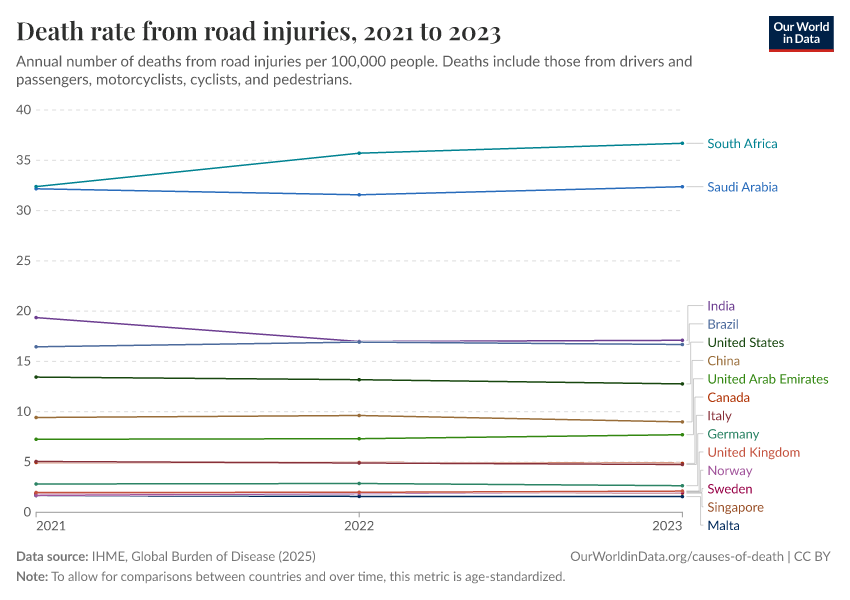 IHME, Global Burden of Disease (2025) – with major processing by Our World in Data. “Death rate from road injuries – IHME” [dataset]. IHME, Global Burden of Disease, “Global Burden of Disease - Deaths” [original data]. Retrieved April 14, 2026 from https://data-childlabor-ilounicef.owid.pages.dev:8789/20260323-161325/grapher/death-rates-road-incidents.html (archived on March 23, 2026).